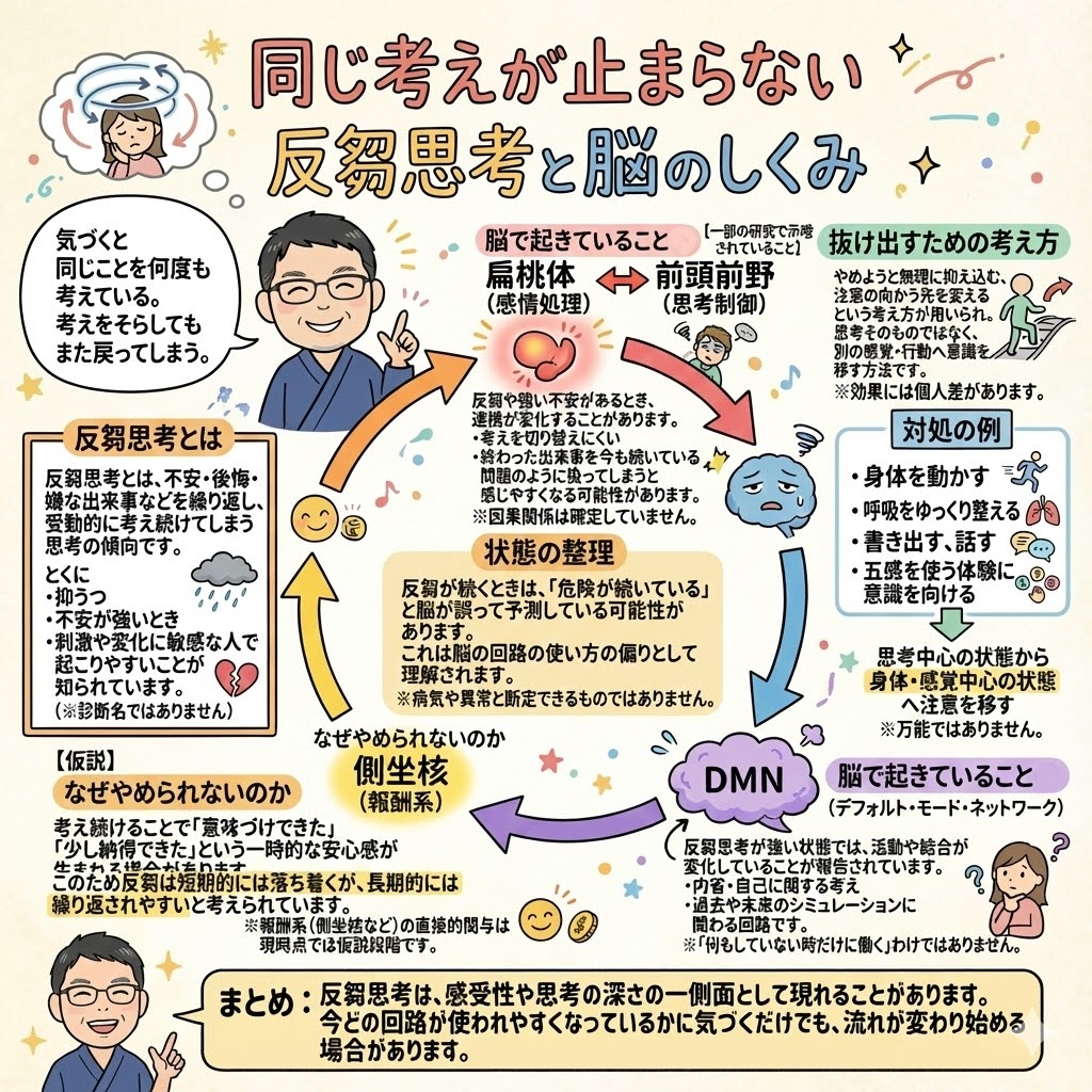 このような状態は心理学で「反芻思考(rumination)」と呼ばれ、 不安や恐怖、後悔といった感情をきっかけに起こりやすくなります。